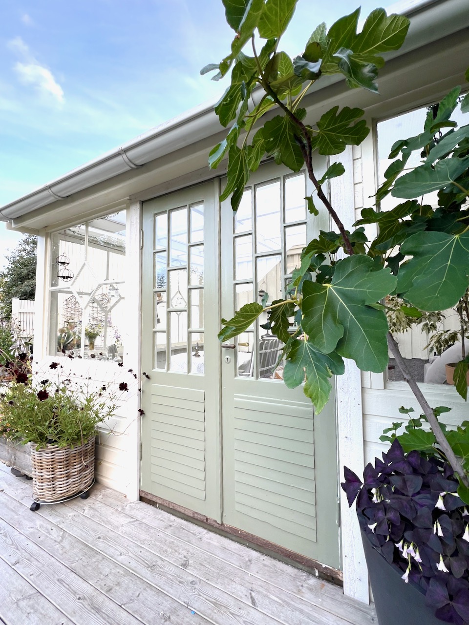 Altanen avgränsas av en avenbokshäck, miskantus, en perennrabatt och en sommarrabatt som flankeras av en låg buxbomhäck. På altanen har vi perenner och sommarblommor i krukor, fikonträd och små blickfång.